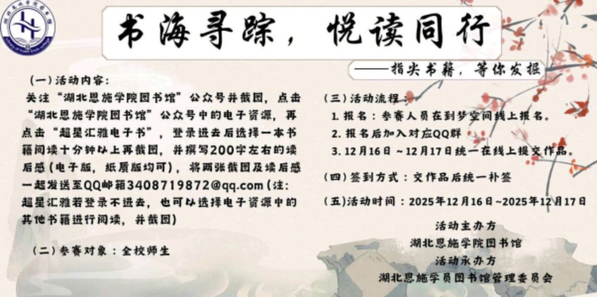 本网讯 (通讯员 王佳羚/文)当指尖触达屏幕,当书香跨越时空,一场联结传统与现代的阅读盛宴正式登场。为适应移动互联网时代阅读模式的转变,进一步推广数字阅读资源,湖北恩施学院图书馆于2025年12月13日正式开启“书海寻踪,悦读同行”线上阅读推广活动报名通道,向全校学生发出沉浸式阅读邀约,让智慧阅读在校园落地生根。 随着信息技术发展,阅读方式日趋数字化、碎片化。为满足师生便捷高效的阅读需求,图书馆积极推进...